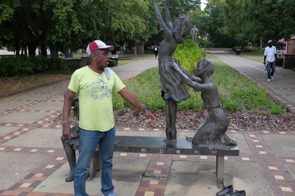 The Four Spirits sculpture was unveiled at Kelly Ingram Park on September 2013 to commemorate the 50th anniversary of the 16th Street Church bombing. The sculpture was crafted by Birmingham-born sculptor Elizabeth MacQueen and designed as a memorial to the four girls killed in the bombing. It depicts the four girls in preparation for the church sermon at the 16th Street Baptist Church in the moments immediately before the explosion. The youngest girl killed in the explosion (Carol Denise McNair) is depicted releasing six doves into the air as she stands tiptoed and barefooted upon a bench another barefooted girl (Addie Mae Collins) is depicted kneeling upon the bench, affixing a dress sash to McNair; a third girl (Cynthia Wesley) is depicted sitting upon the bench alongside McNair and Collins with a book in her lap. The book depicts a refrain from William Butler Yeats’ poem, The Stolen Child. The fourth girl (Carole Robertson) is depicted standing and smiling as she motions the other three girls to attend their church sermon. At the base of the sculpture is an inscription of the name of the sermon the four girls were to attend prior to the bombing—”A Love that Forgives.”