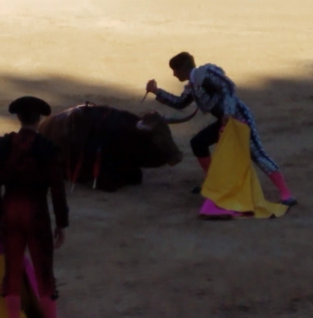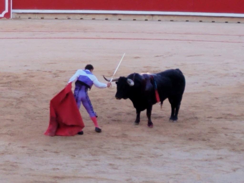 The last act is the sword and the muleta. The muleta is a red cloth folded over a stick. With the muleta the matador masters the bull before going in for the kill. Finally the matador kills the bull by thrusting the sword high between the shoulder blades of the bull.
