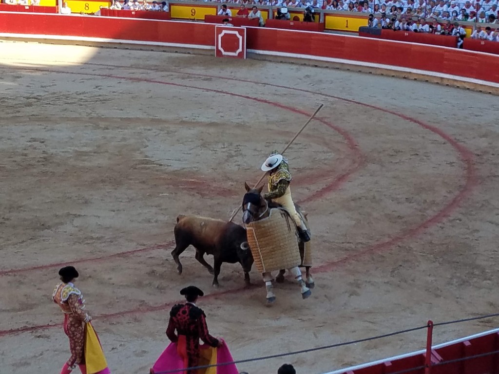 There are three acts to every bullfight. They are always the same. The first act is where the bull charges the picadors and the matador distracts the bull with his cape. The picador drives the steel of the pic into the neck muscles of the bull to weaken it.