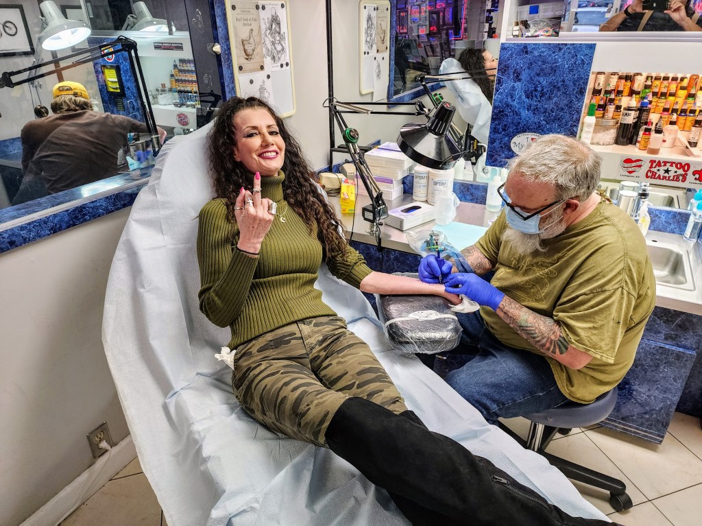Well I’ve lost my equilibrium and my car keys and my pride, The tattoo parlor’s warm, and so I hustle there inside And the grinding off the buzz-saw, “What you want that thing to say?” I says, “Just don’t misspell her name, buddy, she’s the one that got awayBreathe in PeaceTattoos while you waitUniversal Sign Language