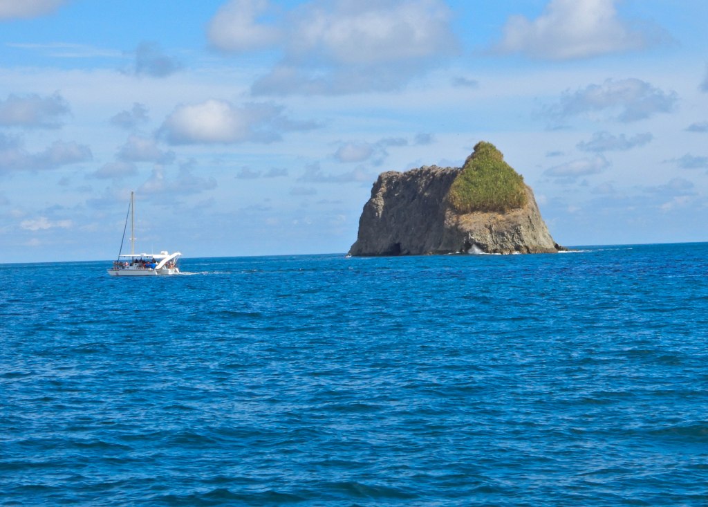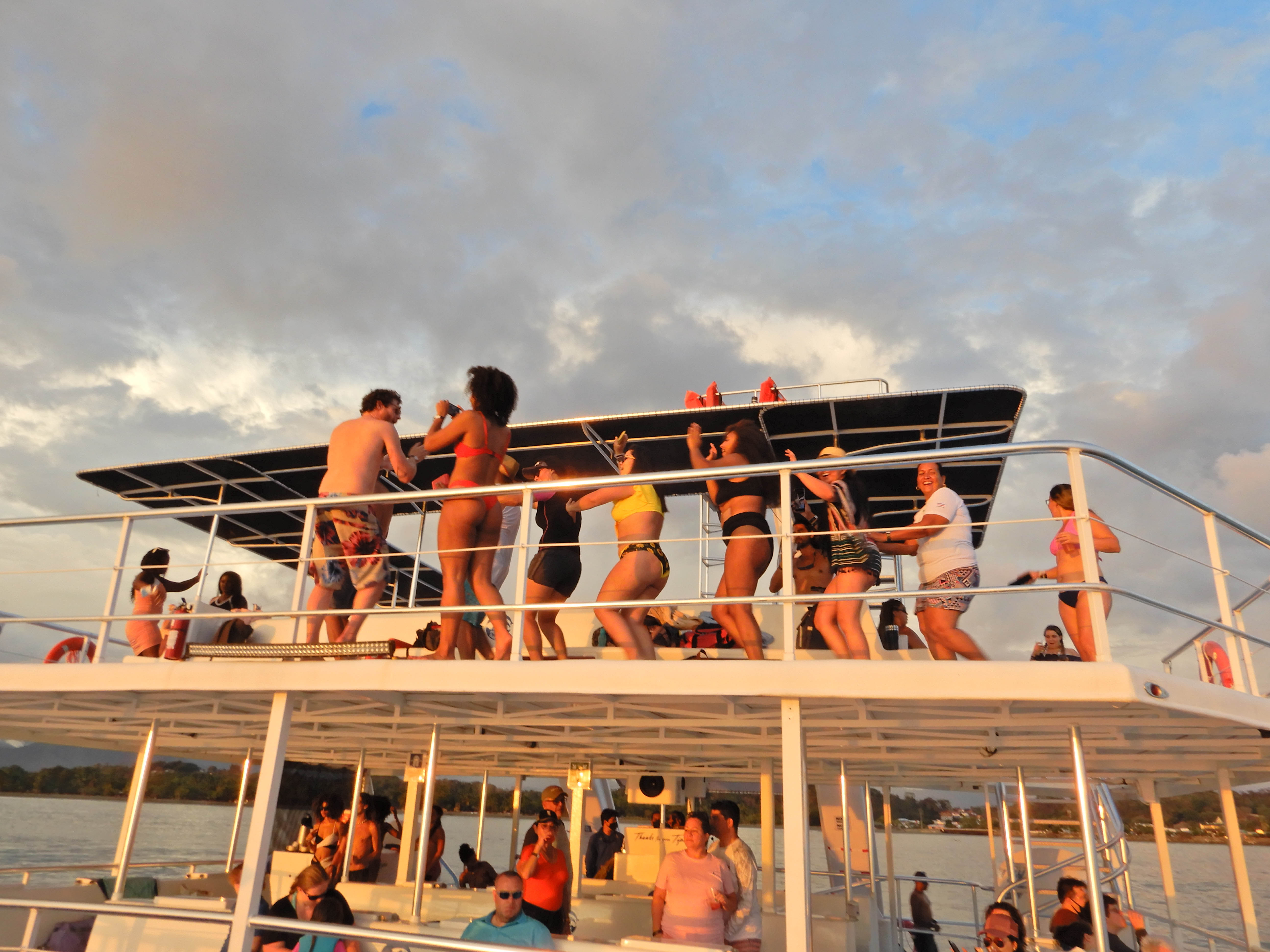 Sat out by the pool in the morning. Had breakfast at the Rico Tico Jungle Grill. At 1:00 we were picked up by our bus driver who transported us down to the docks for our catamaran sunset tour. We boarded The Tom Cat about 2:00 along with the other passengers and “set sail” off into the sunset. Only the sun didn’t set for another few hours so we cruised up and down Costa Rican Coast. We stopped at one point in a little cove to let people dive into the ocean and snorkel if they wanted or slide into the ocean from one of the two water slides mounted on the back of the boat. It was a double decker and people were above board and below deck. There was music and plenty to drink and they even served a late lunch of shish kabob. I was drinking rum. Maureen demurred as they didn’t have anything she liked. It was quite a party and everyone had a lot of fun. The sunset was spectacular and was definitely the highlight of the cruise. I took pictures of course and the other passengers danced a conga line all around the boat. After the sun set, we headed back for the docks. On the way back we observed dolphins jumping out of the water in pairs to the delight of everyone on board.