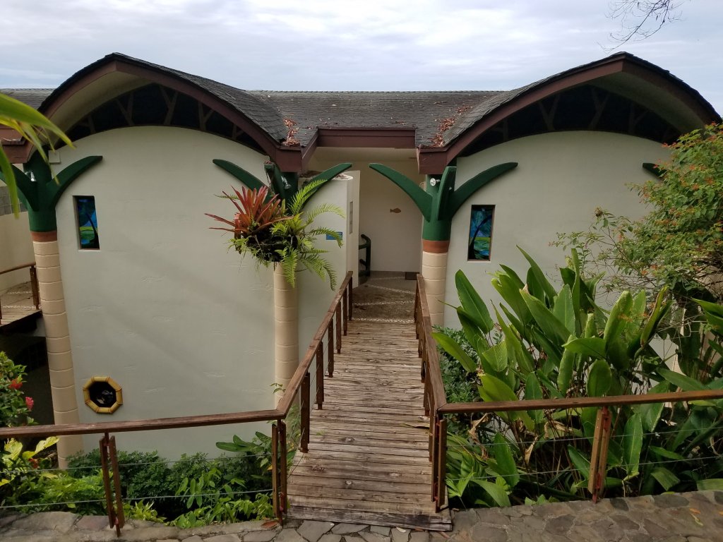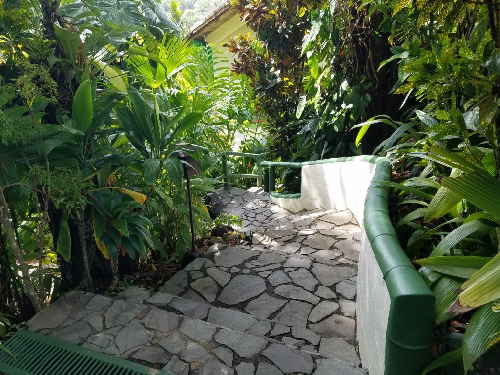 We drove all day through the fog on narrow twisty roads through the mountains. We stopped a couple of times to stretch our legs and relieve ourselves. We also stopped for lunch at another roadside attraction. I had the typical Cost Rican lunch which I never tire of. We finally reached our destination in Manuel Antonio about 5:00 in a driving rain. We checked into the hotel, Si Como No, and went to our room. We were given umbrellas and a staff person brought our luggage. The rooms were little cottages perched on the cliffs in the jungle overlooking the Pacific Ocean.