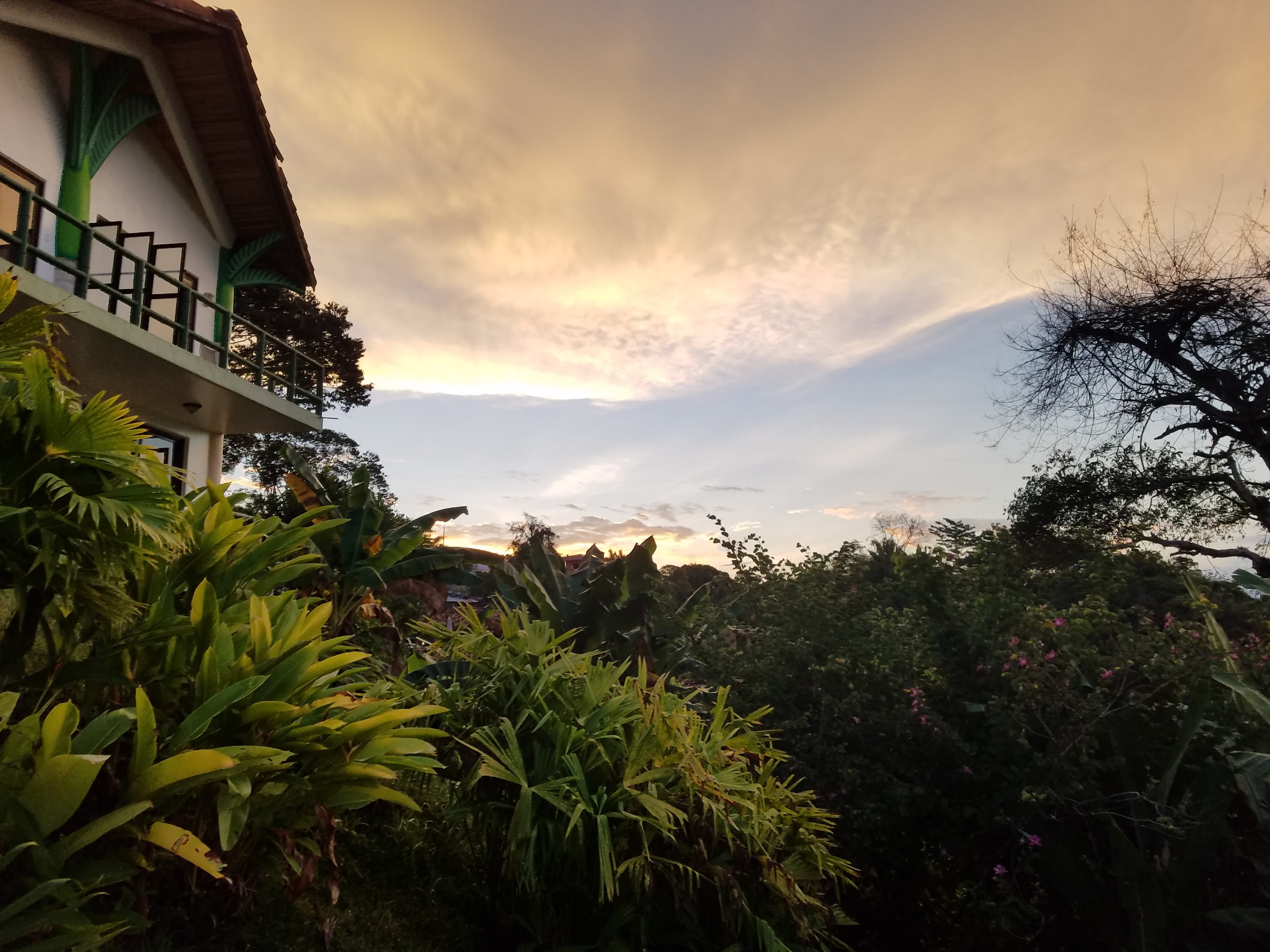 When we got back to the hotel, we had a couple of drinks out on the patio before dinner. We showered and changed clothes, then walked down to the Sura for dinner. I had the typical Costa Rican dinner with chicken beans, rice, salad, and plantains. Maureen had the eggplant. The food was delicious! I had a shot of 30-year-old Centenario rum on the rocks and Maureen had a gin and tonic.