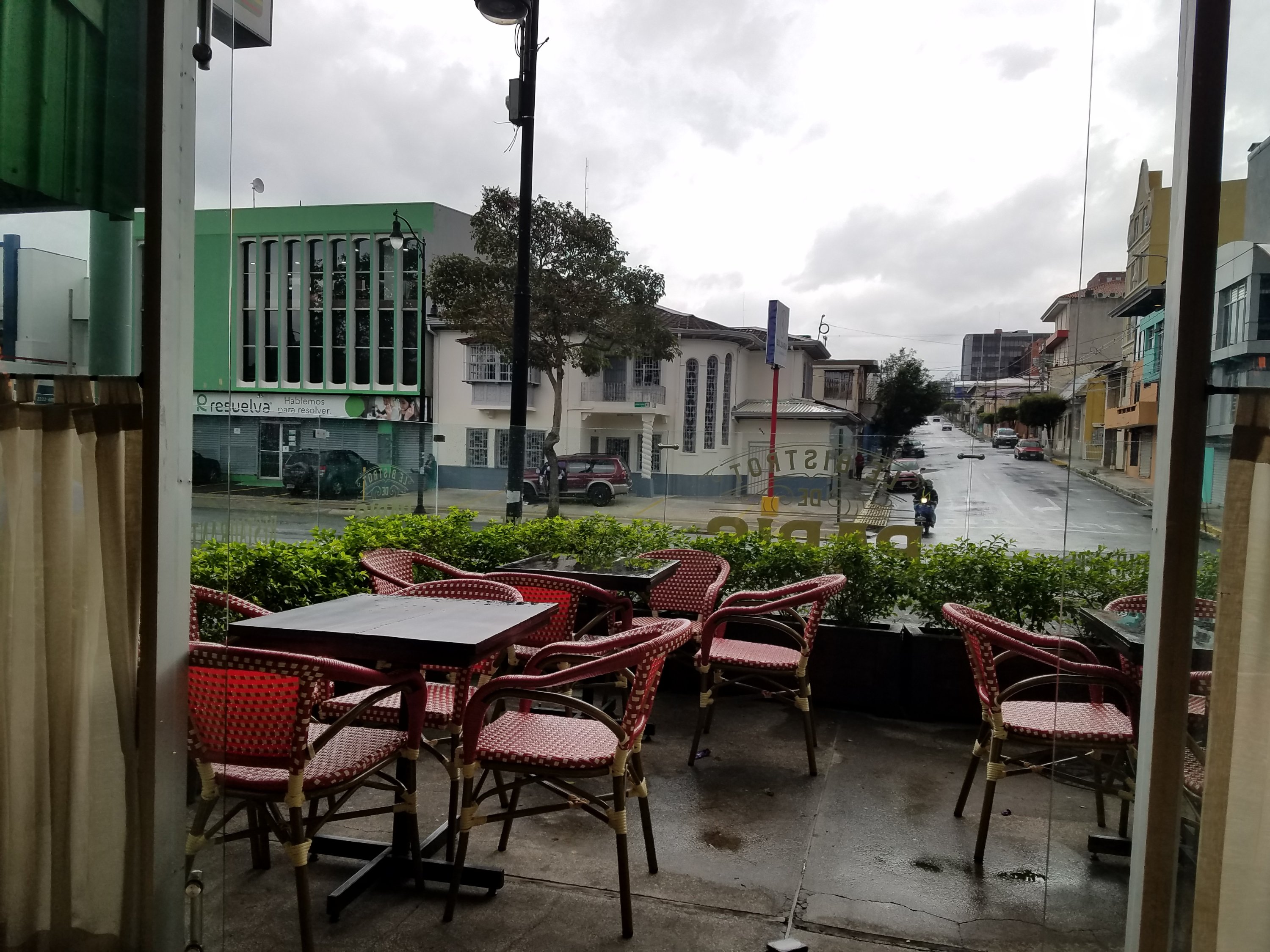We reached the restaurant and went inside. Turns out it was a French Bistro. Who would have thought we would find a French side walk café in downtown San Jose, Costa Rica? But yet, there we were. The name of the bistro was Le Bistot De Paris. We were seated at a table before an open patio leading to the street and were able to see the moveable feast that was San Jose all the while protected from the rain. We ordered a cheese plate and escargot and a bottle of wine. It was a lovely way to pass a couple hours before we walked back to the hotel.